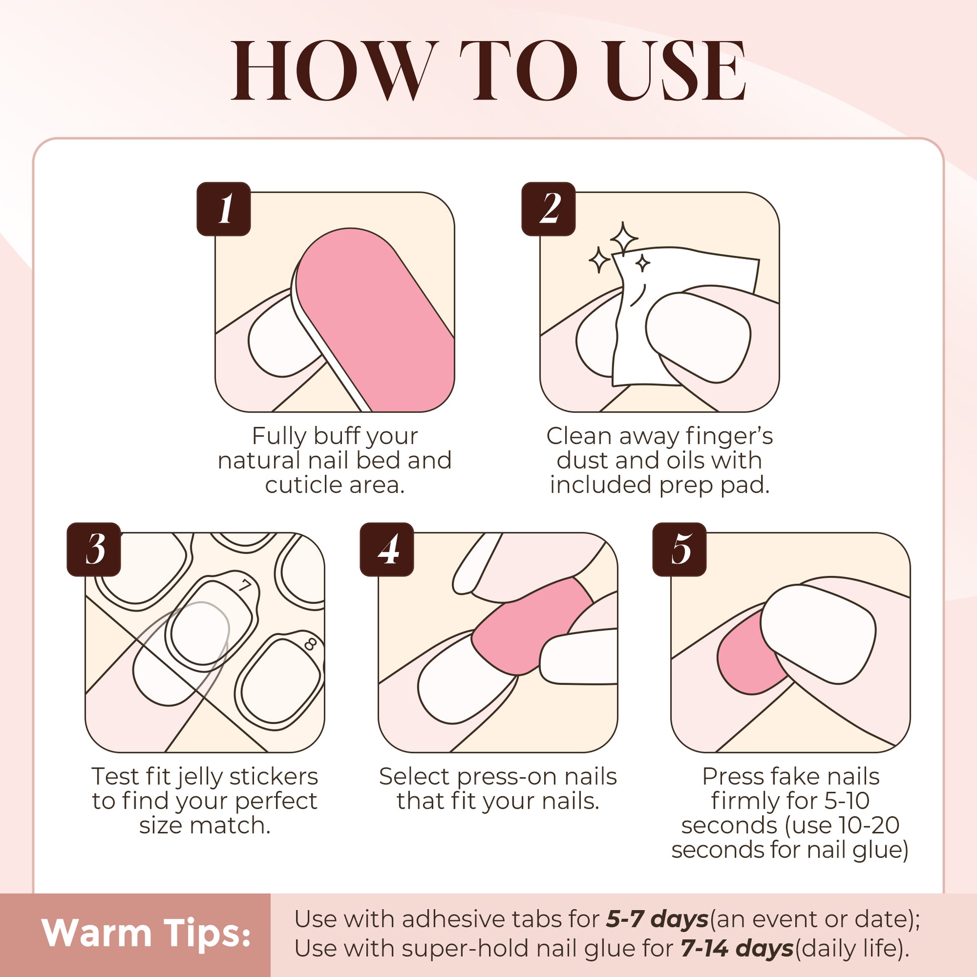 - You're in control. Choose the wear that works for you: For a hold that lasts over two weeks, we recommend using nail glue with adhesive tabs. Prefer to change styles weekly? Nail glue alone is perfect. Or, for a temporary look for a big event, adhesive tabs are your best choice for easy, damage-free removal.