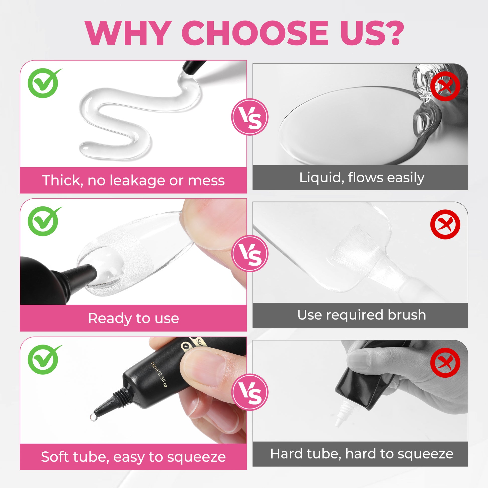 - [NO U V LIGHT NEEDED & QUICK DRYING] Skip the hassle of U V/LED lamps and long curing times. Our 15g semi-solid nail glue is extremely beginner-friendly and air-dries quickly. Achieve a salon-quality manicure at home in minutes, perfect for applying press-on nails, acrylic tips, and fake nails effortlessly.